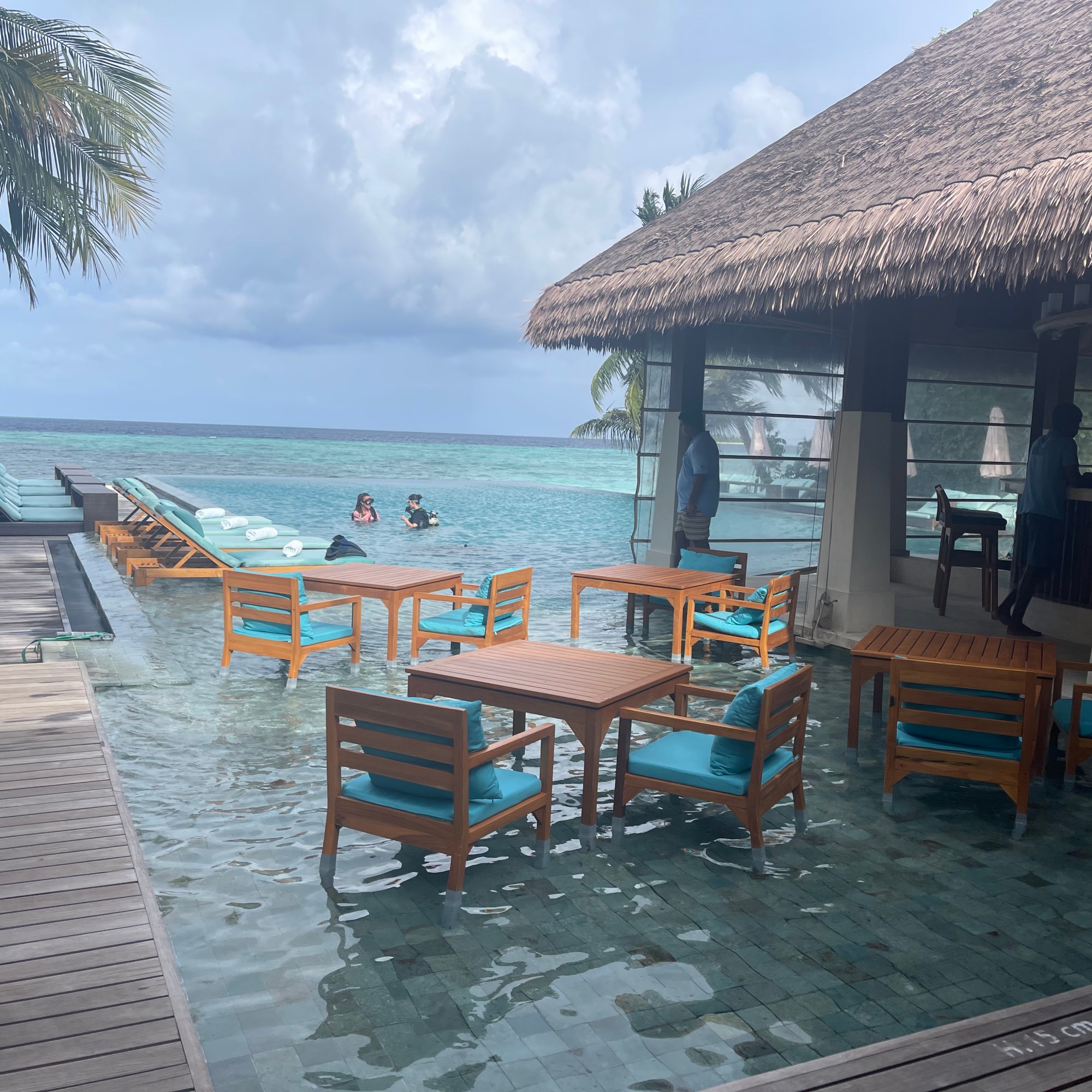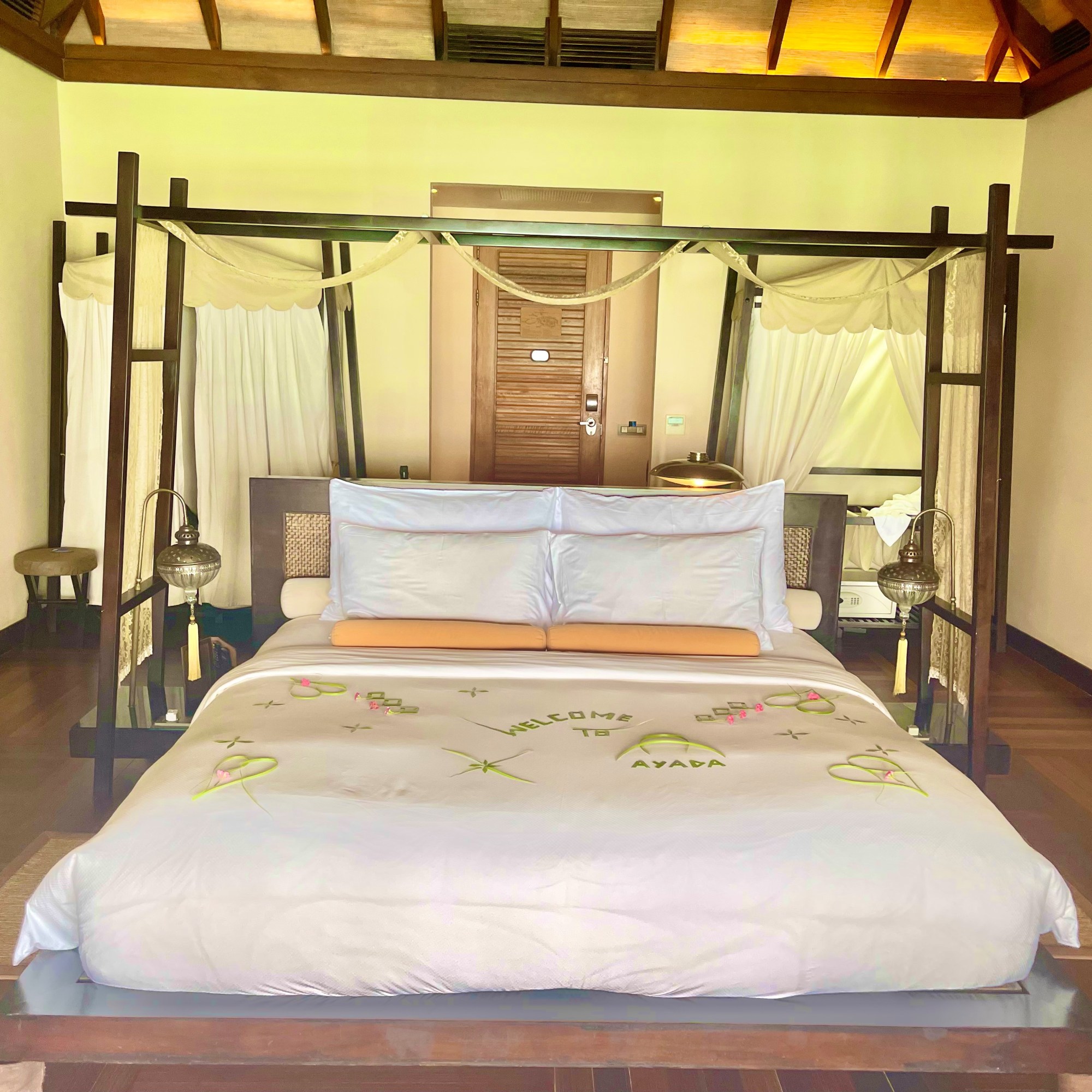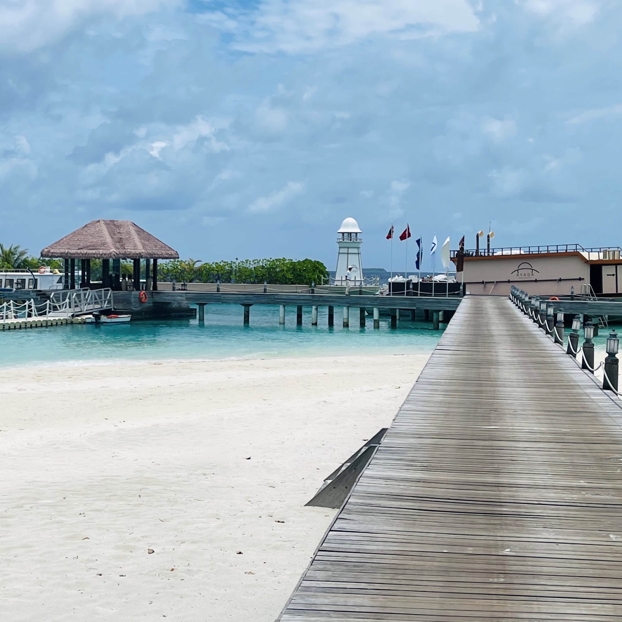 26 hours later we landed in Maldives. Each hotel seemed to have an attendant waiting at arrival to guide guests to a lounge for a meal while waiting for another plane to take us directly to our islands. Every resort in Maldives seemed to occupy an island. After a 30 minutes flights we landed at a small airport where a helper was waiting for us to board our ferry to Ayada Maldives. Listed among the top 25 resorts worldwide on TripAdvisor & winner of Traveler’s Choice 2021. As our ferry approached the dock, we could hear signing and instruments playing. Various hotel representatives welcomed us with hot towels and placed a lei on our necks. Our butler immediate recognized us and addressed us by name; led us to his golf cart and gave us a tour of the resort before taking us to our Ocean Suite Villa.