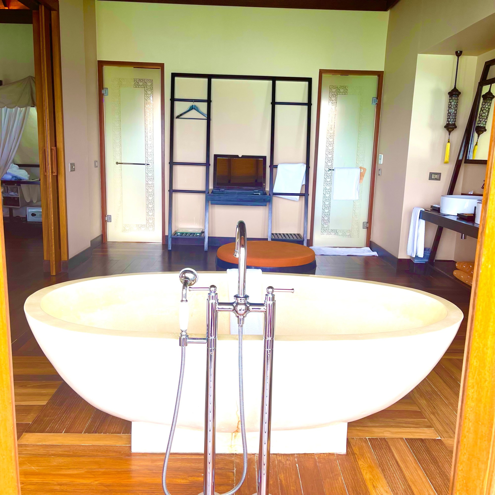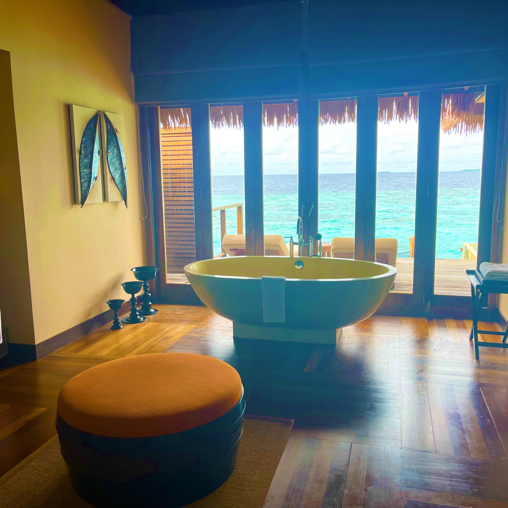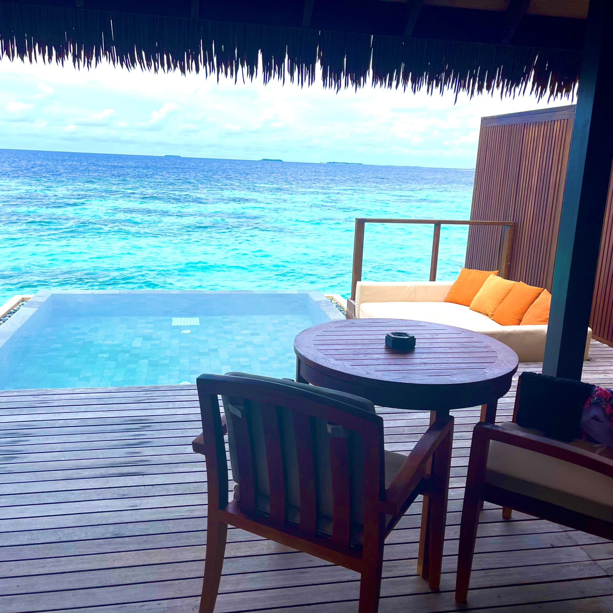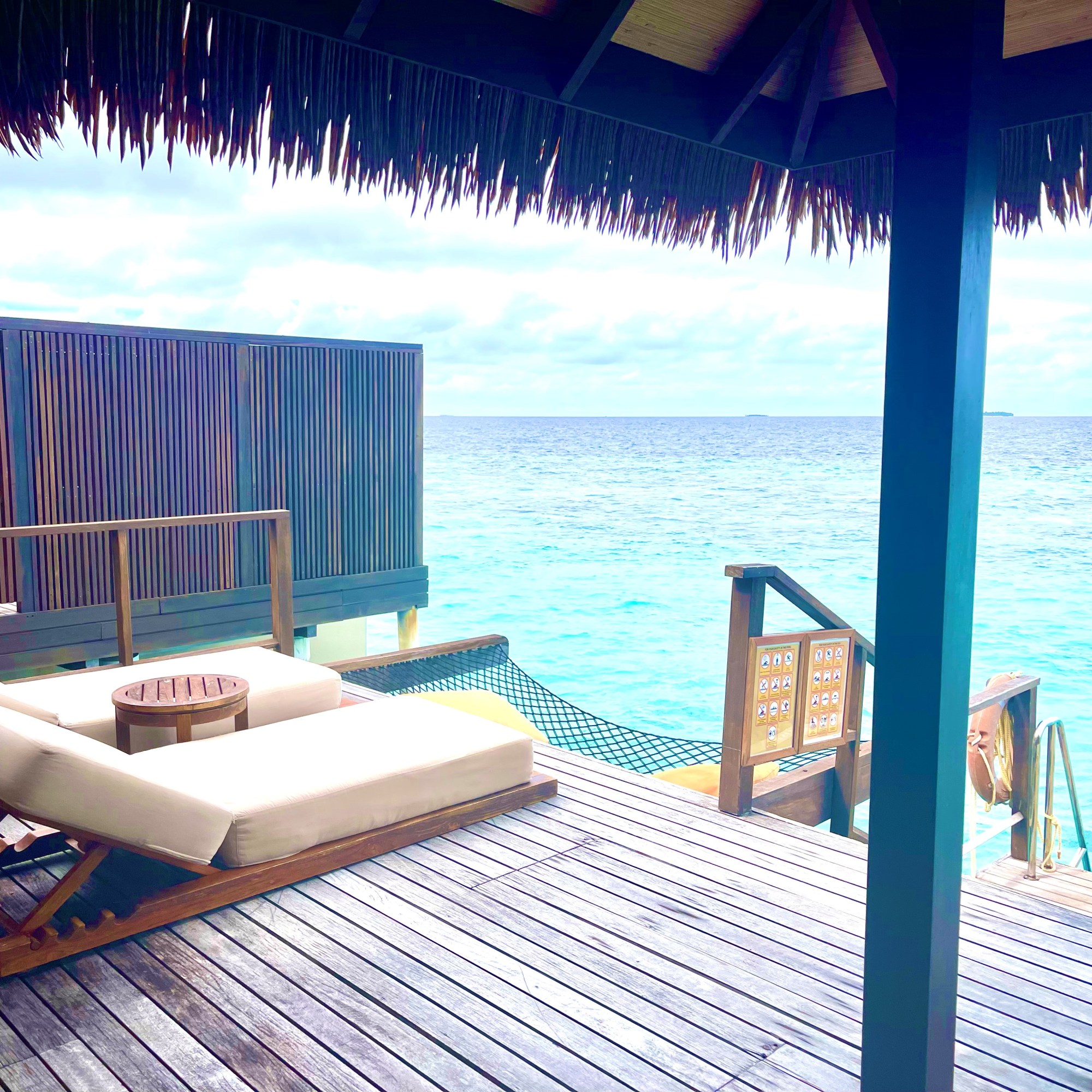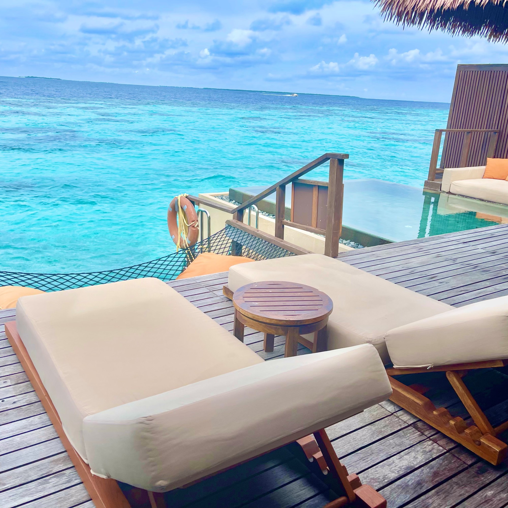 Our overwater bungalow poised over the lagoon offered sheer extravagance and tranquility. The spacious one-bedroom villa offered a private outdoor terrace, ocean hammocks, plunge pool, bathtub, and outdoor shower with an endless view of the horizon with direct beach access.