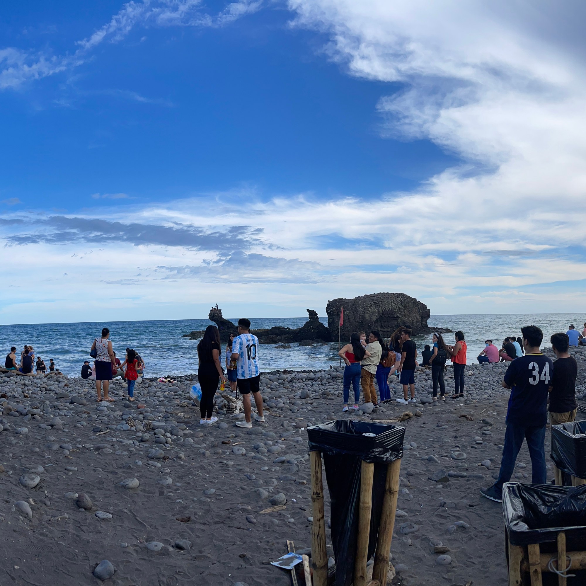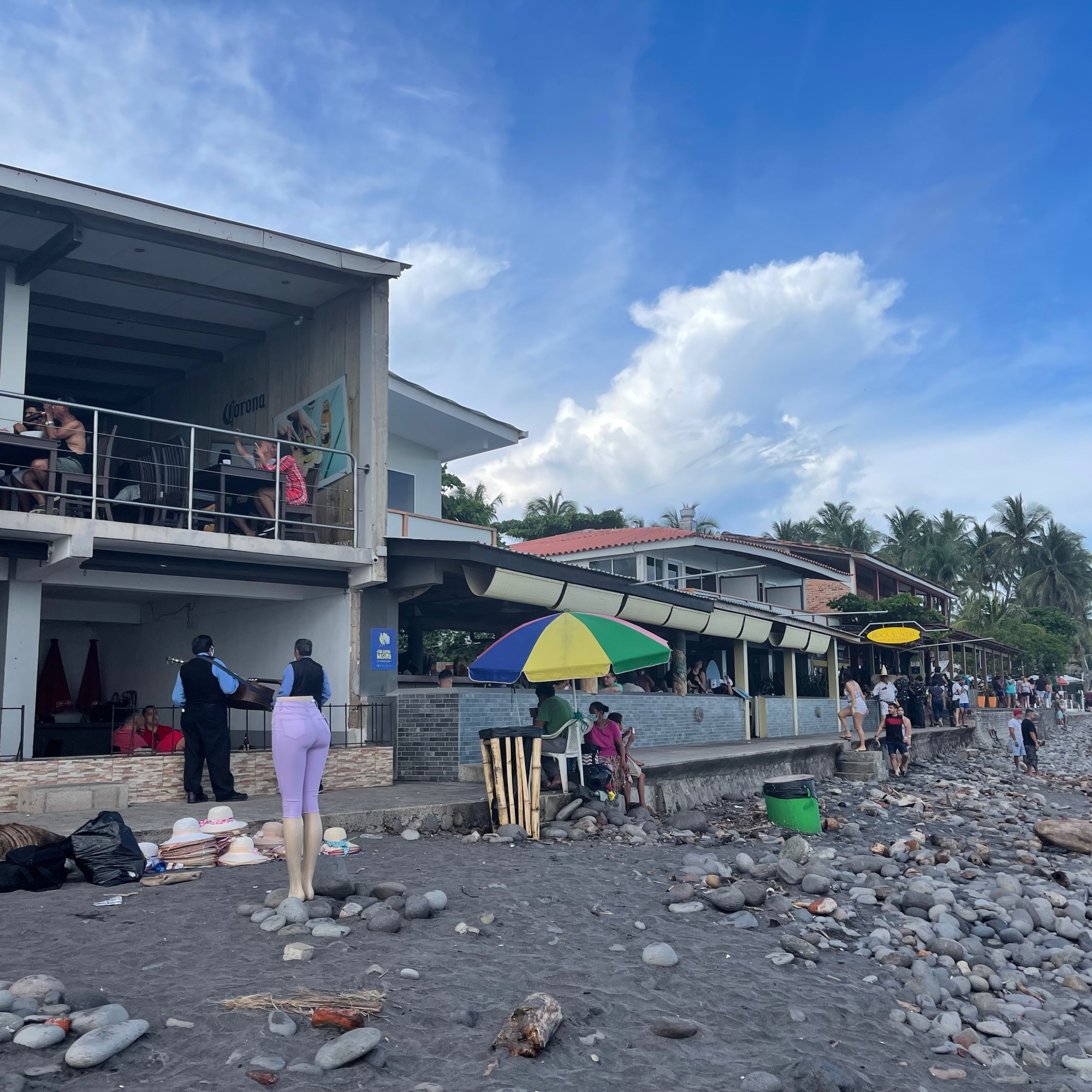 After the hike we drove to Playa El Tunco or The Pig” a prominent surfing spot. The name comes from the large rock mass out of the water that seems like a pig belly up. A large part of the beach had pebbles, so it was not the best for walking. People were swimming on one side of the beach while surfers were on the other side. In El Tunco there were many accommodations, beachfront bars, local stores, restaurants, souvenir shops, etc… Locals and tourists seemed to flock there late afternoon through the evenings. Among various other activities offered the most relevant was learning how to surf. Before heading to my hotel to finally check-in we grab dinner at